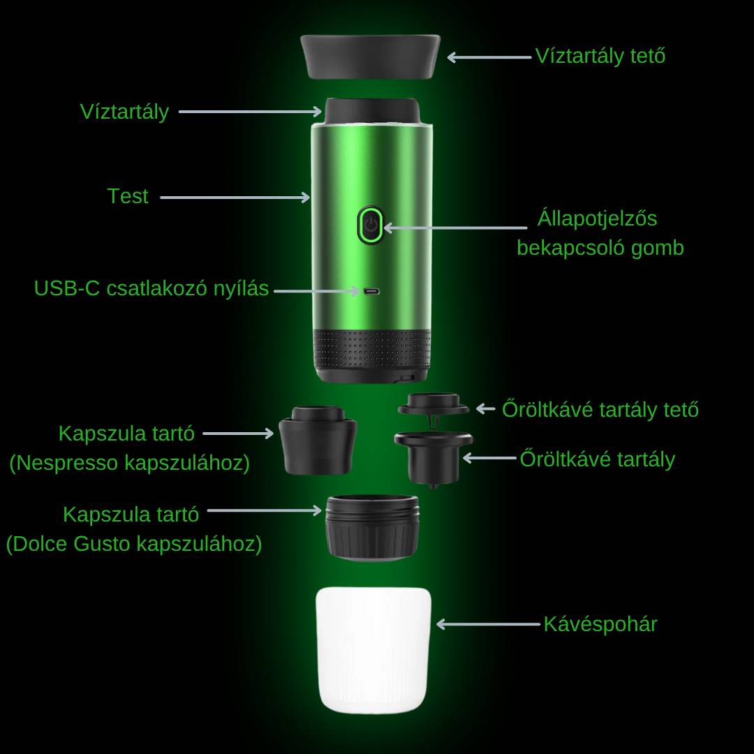 - Hordozható kávéfőző (gép, pohár, kiskapszula tartó, nagykapszula tartó, őröltkévé tartó)